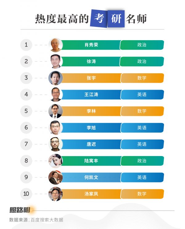 位列其后的,也是执教政治的徐涛老师,和辅导数学的张宇老师。总体来看,政治、数学与英语的考研名师在前十榜单各自分据,任由考生选择。