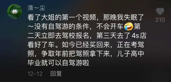 苏敏的自述平铺直叙,但充满坚定。不止一位女性给她留言,表示羡慕她的洒脱,甚至有行动力快的粉丝,在看完她的视频后立即去考了驾照、买了车,等到儿子考高中,就准备去自驾。