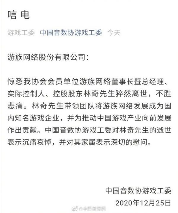 @中国新闻网12月26日消息,12月25日,游族网络董事长林奇去世 。当日深夜,中国音数协游戏工委发布唁电,对音数协会员单位游族网络董事长林奇离世表示沉痛哀悼,并对其家属表示深切的慰问。其中称,“林奇先生带领团队将游族网络发展成为国内知名游戏企业,并为推动中国游戏产业向前发展作出贡献。”