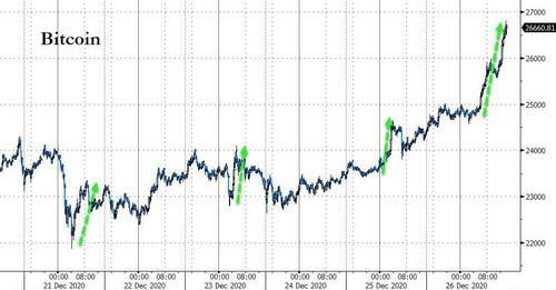 继昨日突破25000美元/枚后,比特币成交价夜间持续上涨,一度逼近27000美元/枚,截至发稿报价26870美元/枚,24小时内涨幅超8%。