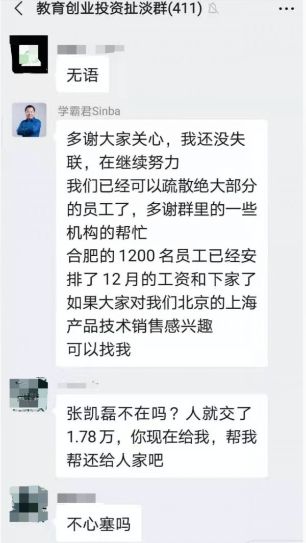 在另一个“学霸君全职教师群”中,还有人表示“总部出现乱象:技术团队电脑被拿走,警察入场,据说是加盟商报警。此外,小班课业务被其他家公司接管,但1V1业务解散,原因是资金链断裂,目前供应商、老师工资、学生退费,大概拿不到了。”