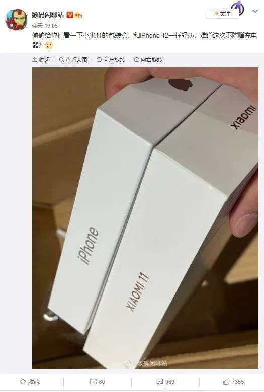 根据数码博主 @数码闲聊站 的消息,小米 11 的包装盒和 iPhone 12 的一样薄,之后该博主在评论中表示盒中确无充电器。