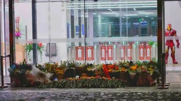 12月26日晚,上海宜山路的游族大楼正门口,地上堆放着用来凭吊林奇的鲜花。图|龚方毅