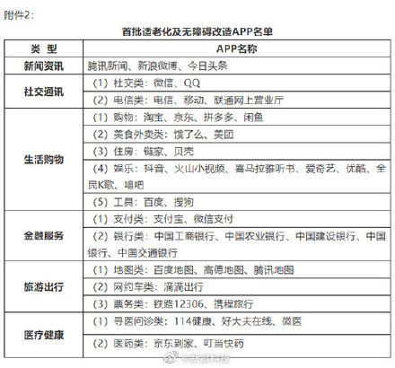 近日,工信部印发通知,自2021年1月起,在全国范围内组织开展为期一年的互联网应用适老化及无障碍改造专项行动。首批优先推动国家相关部委及省级人民政府、残疾人组织、新闻媒体、交通出行、金融服务、社交通讯、生活购物、搜索引擎等8大类、共115家网站进行改造;首批优先推动新闻资讯、社交通讯、生活购物、金融服务、旅游出行、医疗健康等6大类、共43个APP进行适老化及无障碍改造。