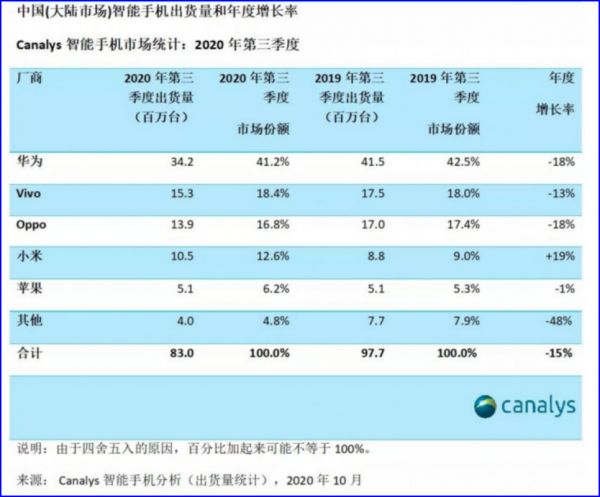 Canalys发布的三季度中国智能手机市场报告显示,第三季度,中国智能手机市场出货8300万台,较上季度下滑8%,较去年下降15%,名列前茅的厂商中,华为、vivo、OPPO出货量均有所下滑,但小米成为唯一增长的厂商,出货量达到1050万台,同比增长19%。