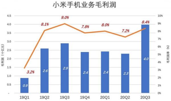 在2020年第三季度,手机硬件贡献了476亿的营收以及39.8亿的毛利润。