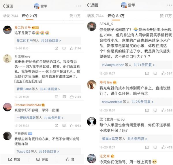 尽管雷军表示会在发布会上聊一聊行业惯例和环保之间是否有解决方案,但这条微博并没有引起“米粉“的共鸣,反而使雷军成为网友讽刺的对象。评论区中网友大多以不满和嘲讽为主。