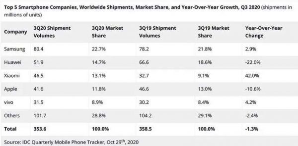 IDC数据显示,第三季度全球智能机出货量为3.536亿部,较上年同期下滑1.3%。三星继续以22.7%的市场占有率排名第一。华为位居第二,但出货量同比下滑22%至5190万部,市场占有率为14.7%。