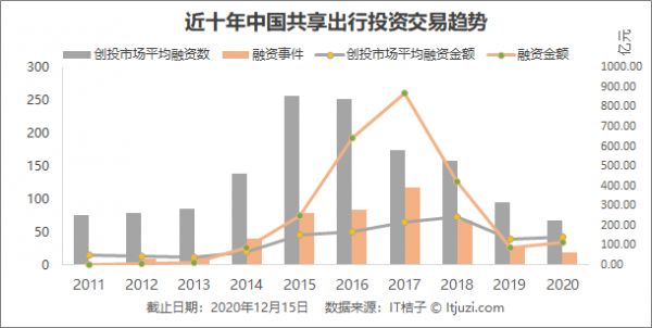 2017 年,共享出行概念盛行,融资事件数虽不多,但融资总额却是 2015 的 3.5 倍。到 2020 年,共享出行投资市场遇冷,获得投资的仅有 Gofun 出行、首汽约车这几家共享汽车平台。