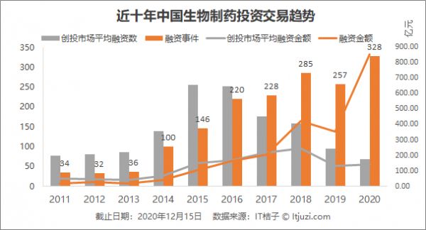 生物制药行业从 2017 年开始投资热度指数明显开始高于市场平均融资热度,尤其是在疫情蔓延的 2020 年,医药行业备受瞩目,反应到投融资数据上就是,融资事件数同比增长 120%,融资金额是 2015 年的 8 倍,同比增长 2.4 倍。