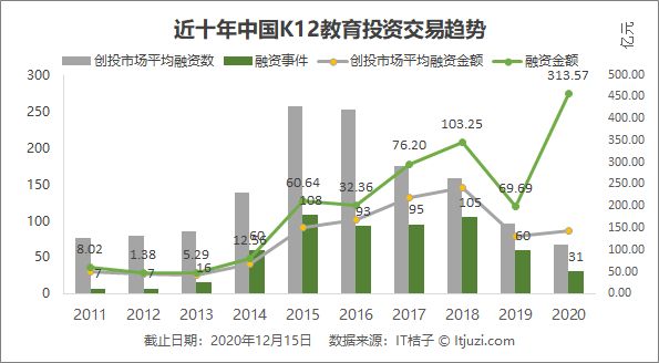 在 K12 教育这个教育行业最大的细分领域里,2011~2015 年投资事件数显著低于平均融资数,2017 年后 K12 融资总额有了大幅提升,超过了创投市场的平均融资总额。到了 2020 年,在线教育爆发,K12 投资越来越集中在 K12 在线上,单笔巨额融资频现——融资总额持续走高,已达到近 10 年的顶峰,但融资事件数却是近 7 年以来的低谷。