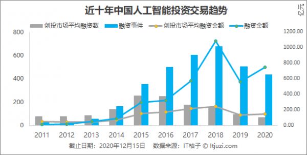 自 2017 年国家颁布《新一代人工智能发展规划》以来,人工智能概念持续走热,投融资事件持续攀升,在 2018 年达到顶峰,融资总额达到 2015 的 3.7 倍。到 2020 年,人工智能投资市场依旧热门,投资事件有 434 起,投资额有 744 多亿元。从 2015 年到现在,人工智能的投资交易数量和金额都远超创投市场各领域的平均交易值。