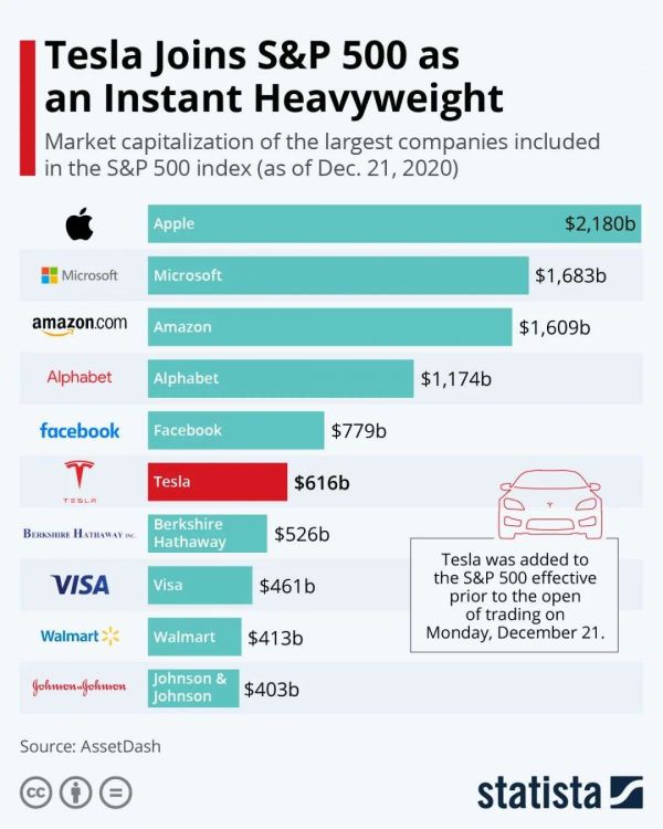 根据当天收盘价格,标普500指数包含的505家公司中,刚加入的特斯拉跻身市值前十。其超过6000亿美元的身价,意味着特斯拉在该指数中的权重超过了1%,高于巴菲特的公司伯克希哈撒韦,但低于Facebook。
