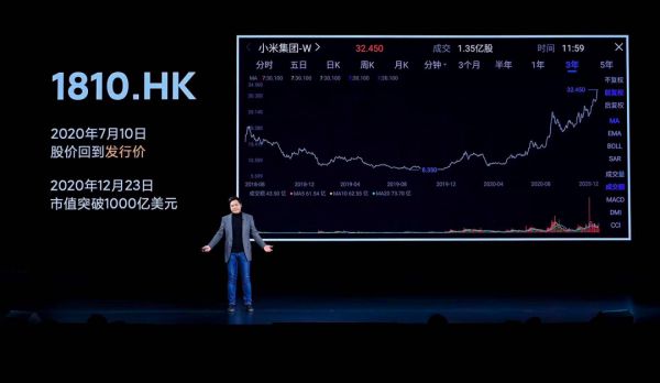 2020年12月23日,小米市值终于突破千亿美元大关,成为中国第六家市值过千亿美元的科技公司,也是这个千亿美元俱乐部中唯一一家以硬科技为主营业务的公司。