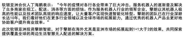 36氪获悉,上海擎朗智能科技有限公司(以下简称“擎朗智能”)宣布完成数亿元C轮融资,本轮融资由软银亚洲风险投资公司(Softbank Ventures Asia)领投,冲盈资本担任本轮独家财务顾问。这是公司在今年内完成的第二轮融资,本轮融资将主要用于进一步加深擎朗配送机器人在国内餐饮市场的渗透、海外市场拓展以及医疗等新事业部的横向发展。