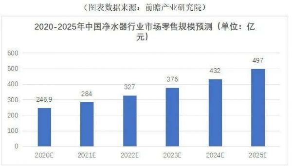 前瞻产业研究院根据近几年中国净水器市场的零售额增速以及市场发展现状进行预测,保守测算到2025年我国净水器行业市场零售规模将接近500亿元,净水市场将进入新的拐点。