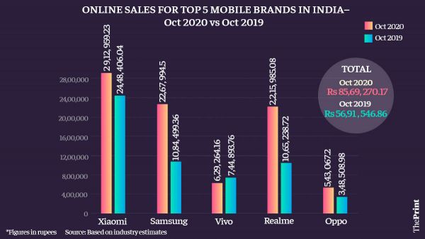 印度手机线上销量前五的品牌中,有四席都被来自中国的手机品牌占据,分别是小米、vivo、Realme和OPPO。今年10月,这四家品牌累积手机销量同比增长36.9%至630.1万部,较去年10月的460.7万部增长了近170万部。