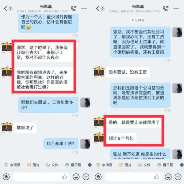 至于工资,员工们并不持乐观态度,认为大概率拿不到钱。有员工晒出和张凯磊的对话截图,张凯磊表示,如果员工不去面试,就更无法拿到12月的工资。但重点是,即便员工面试成功,也只能拿到基本工资。面对员工的赔偿要求,张凯磊没有正面回应,而是强调:“走法律程序,预计8个月起(才能有结果)。”