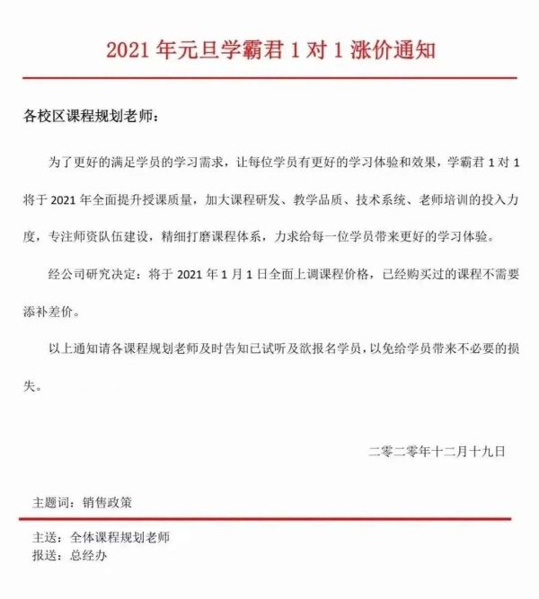 就在学霸君暴雷的前几天,其官方还发出公告称,2021年课程将开始涨价,但旧课时不受影响。有在线教育从业人员告诉「科技新知」:“这是教育机构常用的刺激家长充值的方法。”