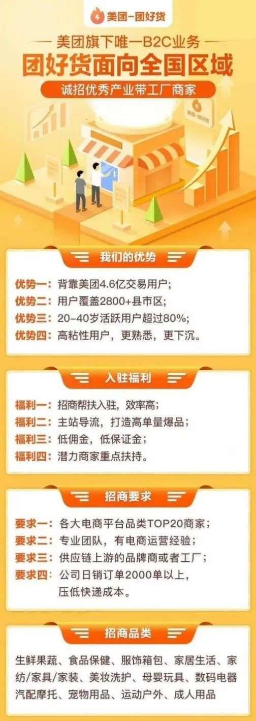 在10月中旬举办的内部动员大会上,美团对到家事业群进行调整,将“团好货”升级为与“闪购”并列的独立事业部,开始在全国范围内面向全品类商品进行招商。招商团队由总监领队,先后深入山东、广东、江苏、河北等地的产业带,拜访当地品牌商和代工厂。