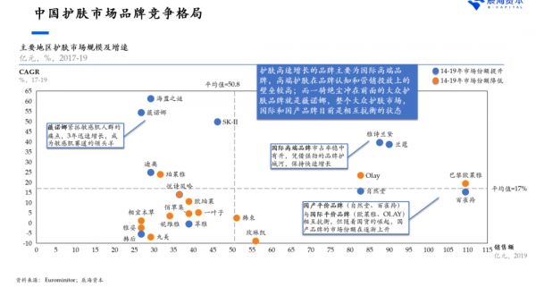 依据辰海资本的数据,如果把护肤品市场划分为高端市场和大众消费市场,那么高端市场里国际品牌更具有话语权,海蓝之谜、SK-Ⅱ、雅诗兰黛、兰蔻等国际品牌的增速处于整个护肤品市场的前列。大众消费市场中,国际和国产品牌相互抗衡,比较势均力敌。