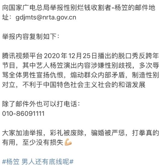 直到12月27日晚,杨笠被扣上“性别歧视”,遭到了举报。