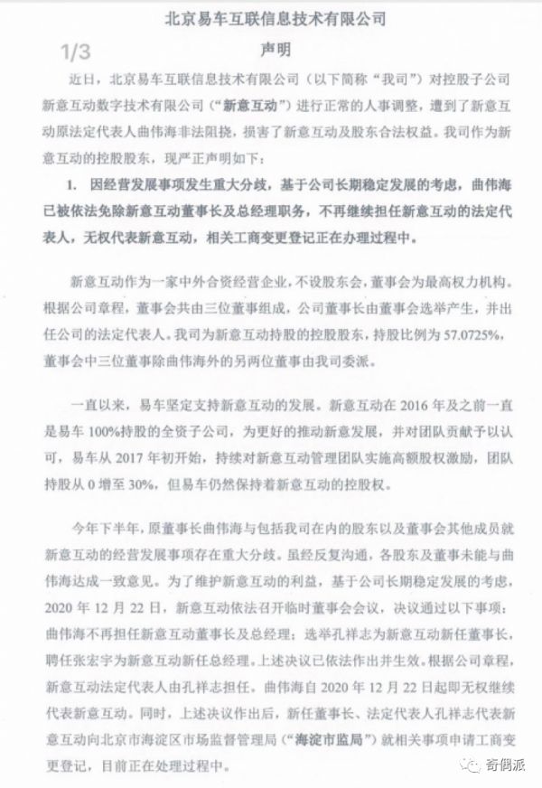 易车在提供的声明中言辞激烈地表示,“12月22日,新意互动召开临时董事会会议,决议免除曲伟海董事长及总经理的职务,选举孔祥志为新任董事长,聘任张宏宇为新任总经理。上述决议已依法作出并生效。根据公司章程,新意互动法定代表人由孔祥志担任,曲伟海再无权代表公司。目前相关工商登记在办理过程中”。