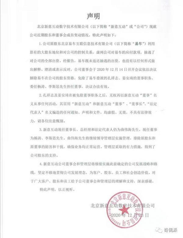 根据前述新意互动方面人士提供的信息显示,2020年12月14日新意互动召开董事会会议,就易车因为抽逃对新意互动的全部出资行为,依法决议解除了易车在新意互动的股东资格,解除了易车委派过来的两位董事,同时成立了新意互动新一届董事会。