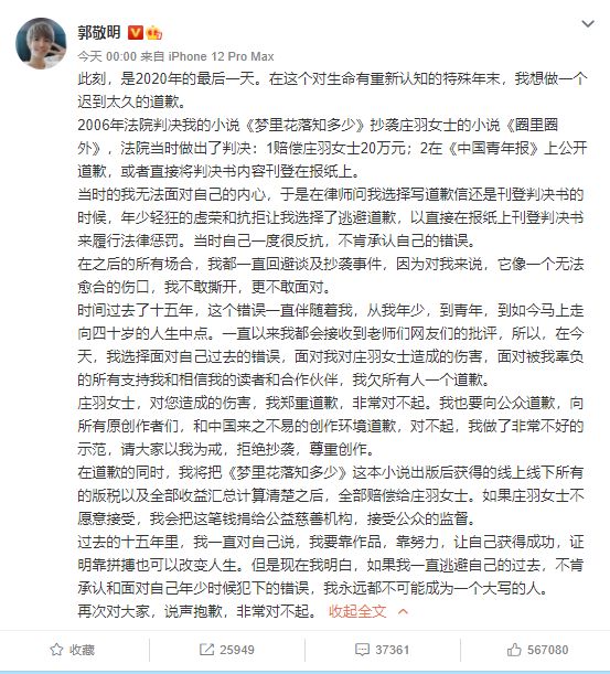 郭敬明除了对庄羽道歉外,也对所有原创者们和中国来之不易的创作环境道歉,“请大家以我为戒,拒绝抄袭,尊重创作”。