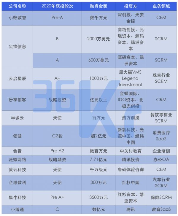 2020年企微服务商和涉及企微生态服务的公司投融资情况