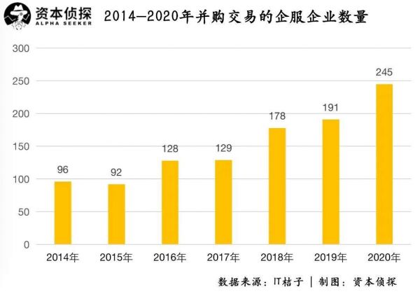 虽然获得融资的企业服务企业数量在减少,但另一方面,相关交易并购的企业数量却在逐渐增加:2015年、2018年和2020年,有过并购交易的企业服务企业数量分别为92家、178家和245家。