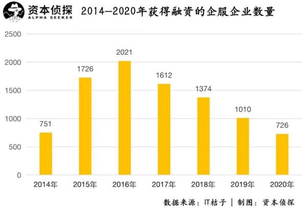 「资本侦探」统计七年的数据发现,从2014年到2020年,获得投资的企业服务企业数量有一个过山车式的变化,获得融资的企业从2014年的751家,上升到2016年的顶峰2021家,后迅速下降至2020年的726家。