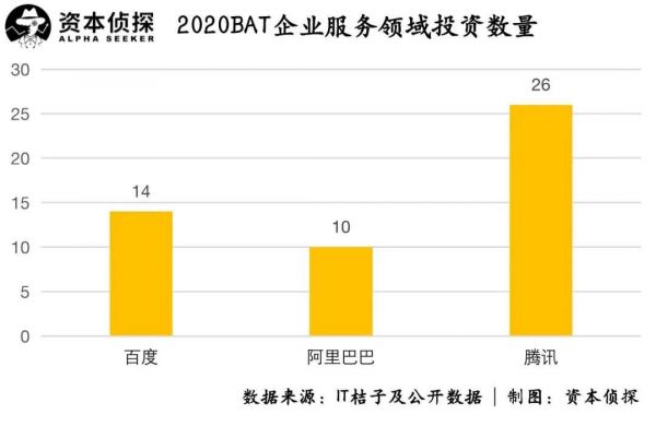 据已有公开资料整理,2020年,百度、阿里巴巴、腾讯共在企业服务领域投资约50家,其中出手最多的是腾讯,投资了26家企业,高于百度和阿里巴巴。三家公司投资的行业主要集中在大数据、云服务、AI、云计算、数字化解决方案等领域。