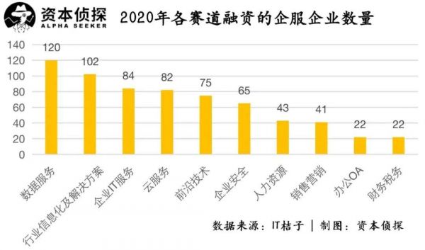 在统计2020年获得融资的企业服务企业所在的细分赛道后,「资本侦探」发现融资数量较多的是数据服务、行业信息化及解决方案、企业IT服务、云服务、前沿技术、企业安全等领域。同时,人力资源、销售营销、办公OA及财务税务等传统TO B领域表现也依旧不错。