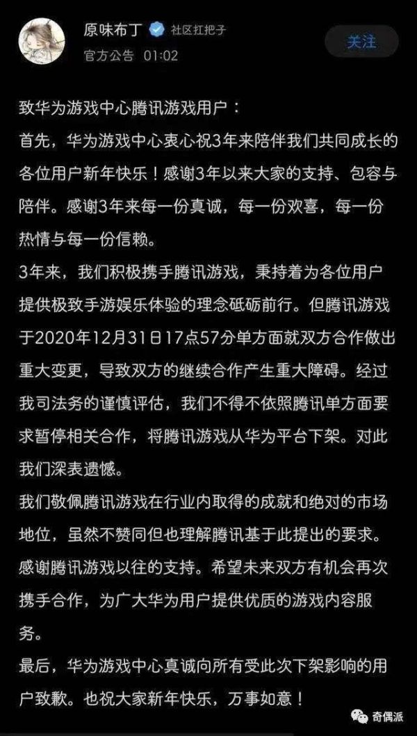 2021 年 1 月 1 日凌晨,华为游戏中心社区发布公告:因腾讯游戏于2020年12月31日17点57分单方面就双方合作做出重大变更,导致双方的继续合作产生重大障碍,经过我司法务谨慎评估,我们不得不依照腾讯单方面要求暂停相关合作,将腾讯游戏从华为平台下架。