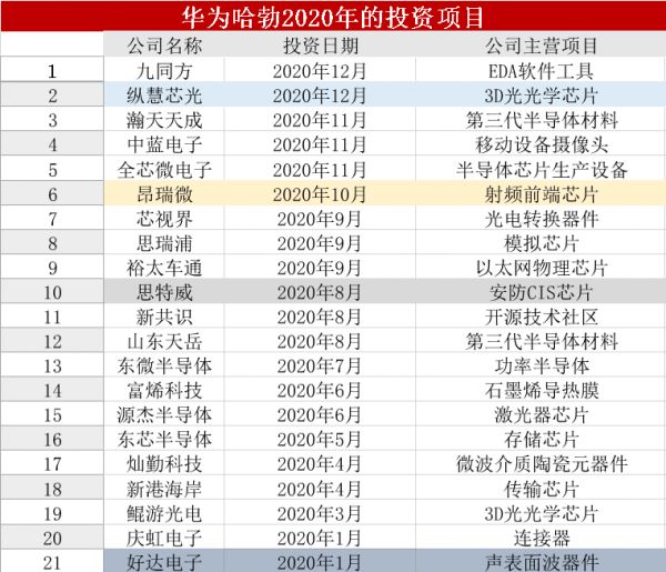 2020年已过,这一年,华为和小米的投资战略似乎已进入到了轻车熟路的阶段。据不完全统计,华为哈勃在过去一年共计投资了21家半导体公司。小米更甚,共投资了30家半导体公司。从两家所投资的企业来看,可以说在半导体材料、芯片设计、半导体设备等产业链上的各个环节都有布局。但细细来看,“英雄所见略同”,两家都看中了一些相同的芯片机会。
