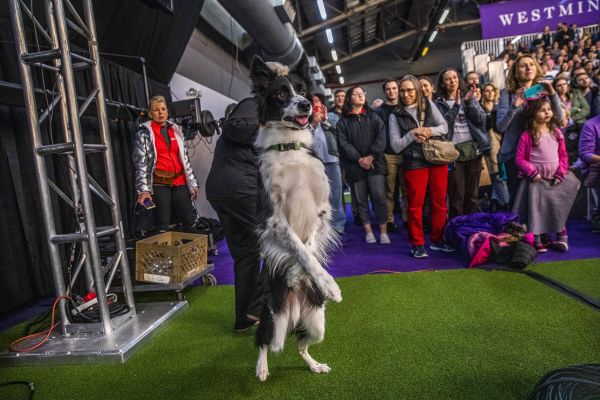 2020年2月,在纽约举行的第144届威斯敏斯特狗狗俱乐部犬展上,一只边境牧羊犬正在观察其他参赛狗狗们的比赛情况。图片来源:Brittainy Newman /《纽约时报》