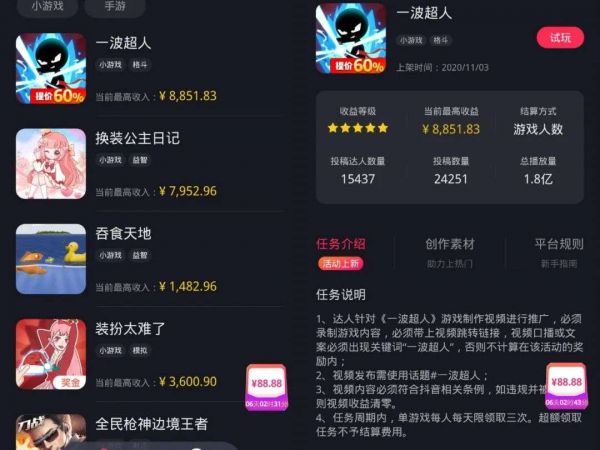 在抖音上搜索“游戏发行人计划”,可以发现很多小游戏任务。达人在指定周期内按照任务要求用短视频推广小游戏,便可以赚取现金收益。这类任务一般要求达人录制游戏内容,附上小游戏的跳转链接,视频口播或文案必须出现游戏名称,且在发布视频时要使用游戏的话题。视频收益取决于有多少用户通过视频点进了游戏链接,并参与了游戏。