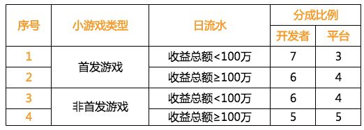 首发游戏日收益总额在 100 万元以内,双方按 3:7 (开发者7)分配收益;日收益总额超过 100 万元以上(含本数),超过部分双方按 4:6 (开发者6)分配收益。