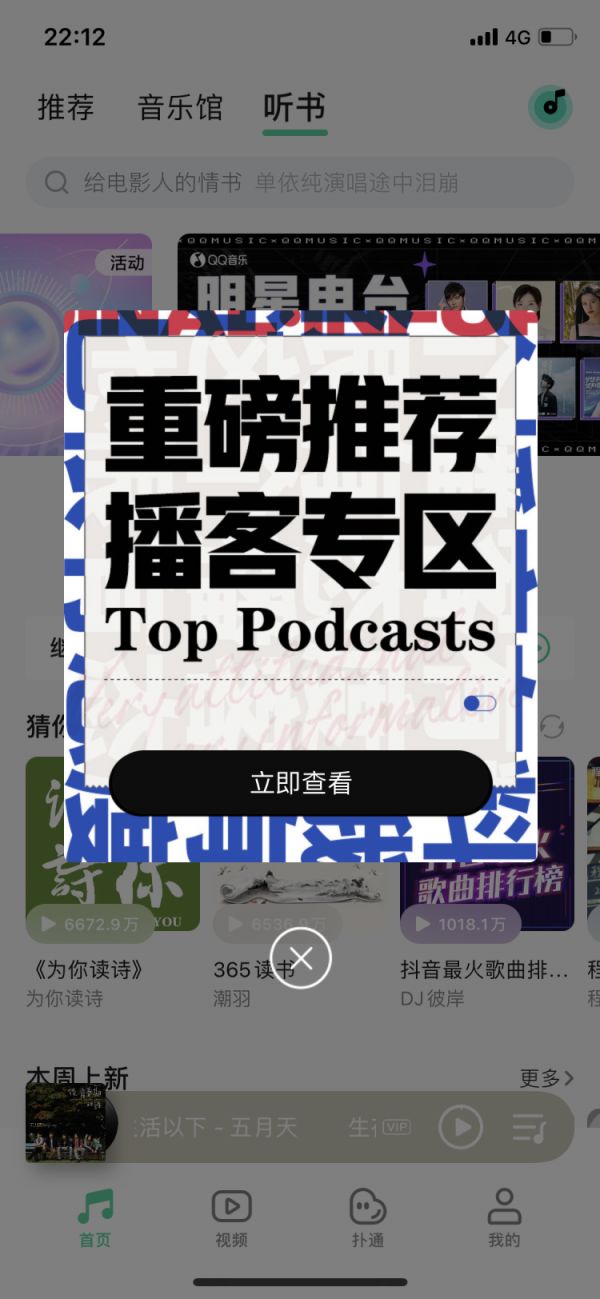 今年早前QQ音乐弹屏向用户推荐播客专区