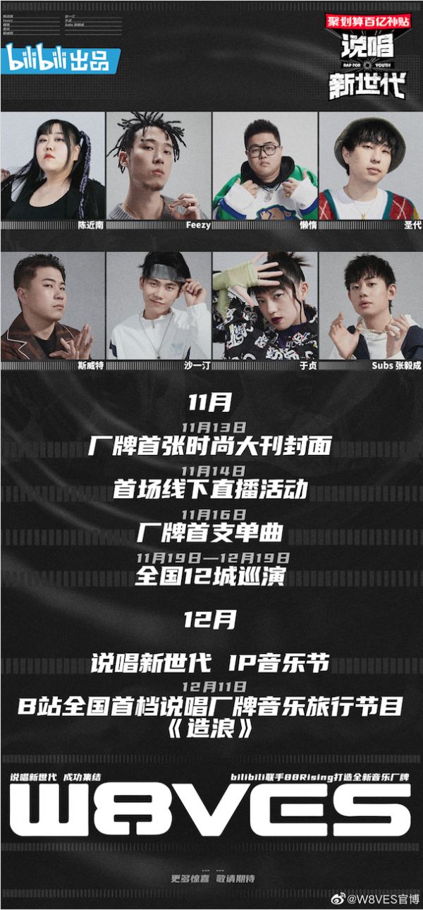 节目收官当晚,B站宣布将联合88Rising打造说唱厂牌W8VES,签下《新世代》八强,厂牌新曲、线下巡演、音乐节等活动将提上日程。