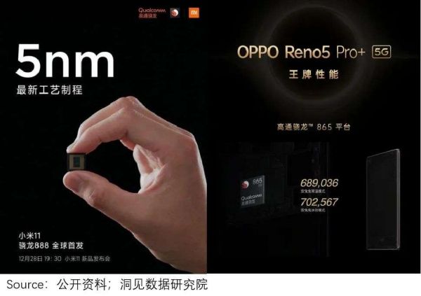 上周,小米11发布(2020.12.28上市),搭乘5nm骁龙888芯片;相比之下,OPPO同期推出的新款5G手机(2020.12.29上市),顶配搭乘的还是7nm骁龙865芯片。