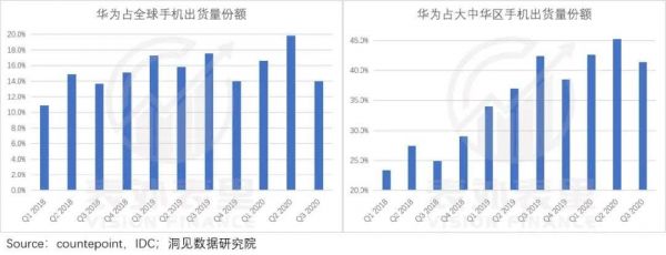 芯片紧缺已经影响到华为手机出货量份额。如下图所示,2020Q3,其在全球市场以及大中华区的出货量份额出现了不同程度的回落。