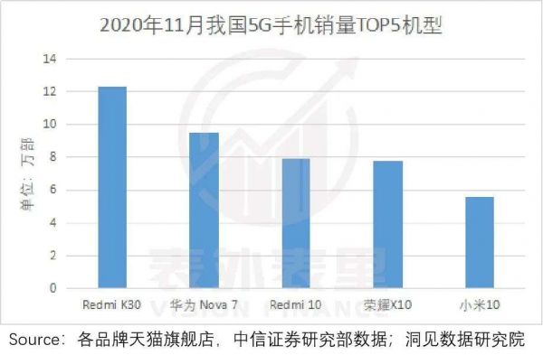 而华为上榜TOP5的华为Nova7、荣耀X10两款机型,都是7nm芯片制成的高端机;小米的三款机型,只有小米10是5G高端机,RedmiK30、Redmi10仍主打性价比。