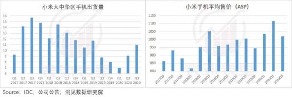 数据显示,和2017Q3~2019Q4手机出货量不断下滑相比,2020年小米在大中华区的手机出货量连着三个季度,出现持续性增长。同时,手机的ASP(平均售价)同步不断走高。