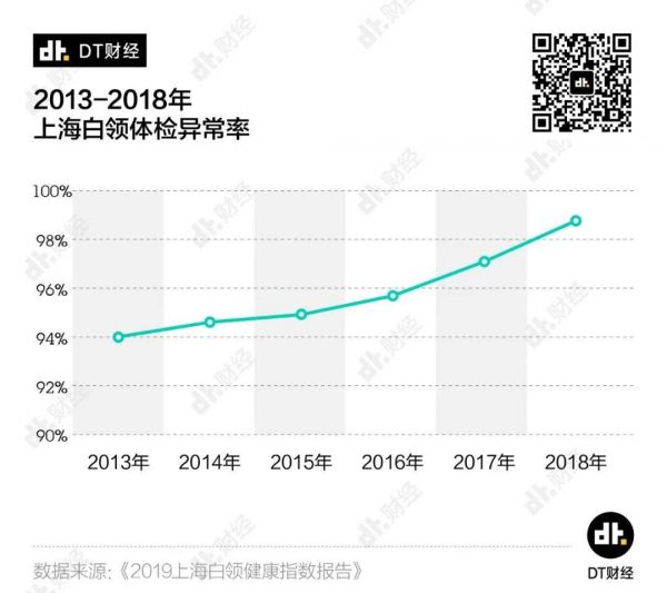 这也就直接导致了体检异常率的逐年上升。从2013年开始到2018年,上海白领的体检异常率从94%上升到了将近99%——基数非常大,异常率更是不断逼近100%。