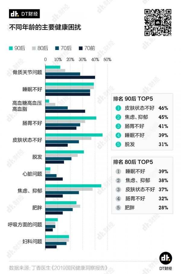 虽然没有太多年轻人正在遭受骨病、三高等疾病,但不健康的生活状态对80后、90后来说已经足够折磨。在《报告》中可以看到,脱发、肠胃不好、皮肤状态差、妇科等问题对年轻人来说是很常见的毛病。另外值得注意的是,随着年龄的降低,焦虑、抑郁等心理问题的提及率也越来越高。