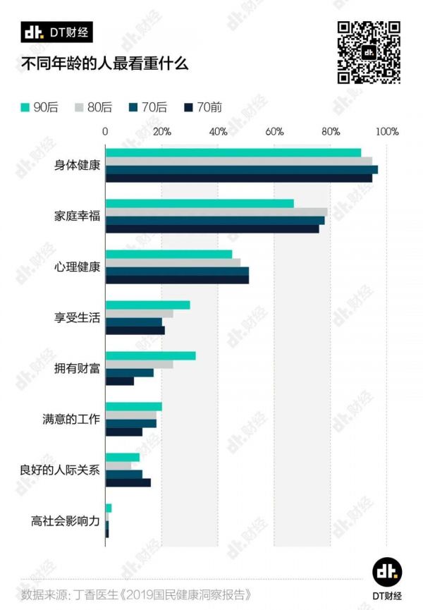 另外,我们还在《报告》中发现了一个有趣的现象:年纪越大对生理、心理健康就越重视,年轻人则更追求享受生活、拥有财富和一份满意的工作。这也与现实非常贴近,就好像社交网站上的投票里,脱贫的优先级永远会高于脱单。李玥说,“温饱都没解决,何以思淫欲,只有财富才能带来安全感。”