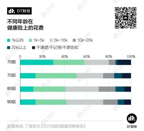 来自于生理上的不适逐渐变得难以忍受,除了老老实实花钱看病,年轻人还把目光放到了保险上。作为亡羊补牢的手段,年轻人需要保险来缓解焦虑。从《报告》中看出,90后与80后在不同价位的保险支出上,比例大致相同。如果单纯地由工作年限判断收入,90后在收入不及80后的情况下,仍然愿意投入相当比例的收入在保险上——健康焦虑让这群爱生活、爱熬夜的年轻人正努力地让自己变得没有后顾之忧。