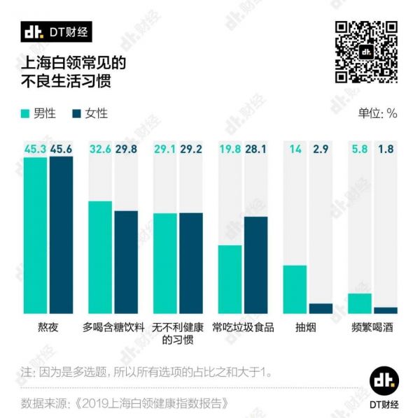年轻人们在生活中的不良习惯也一直未能改善。在《2019上海白领健康指数报告》中,上海白领超过四成的白领有熬夜的习惯,且超过30%的白领经常喝含糖饮料。此外,女性白领还经常吃垃圾食品,男性则容易抽烟、频繁喝酒。